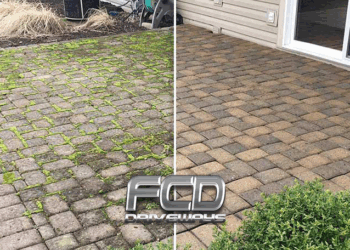 We will first power wash the entire paved area. This removes the existing build up of grime, dirt and moss on your paving. Once it has been completely and thoroughly cleaned, we will let it dry. Once dried, kiln dried sand is added back to your paving joints.